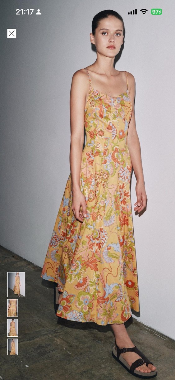 Sarı çiçek desenli, , drapeli ve bol kesim uzun elbise. Yumuşak sentetik kumaştan, bohem tarzında, günlük kullanım için uygun.