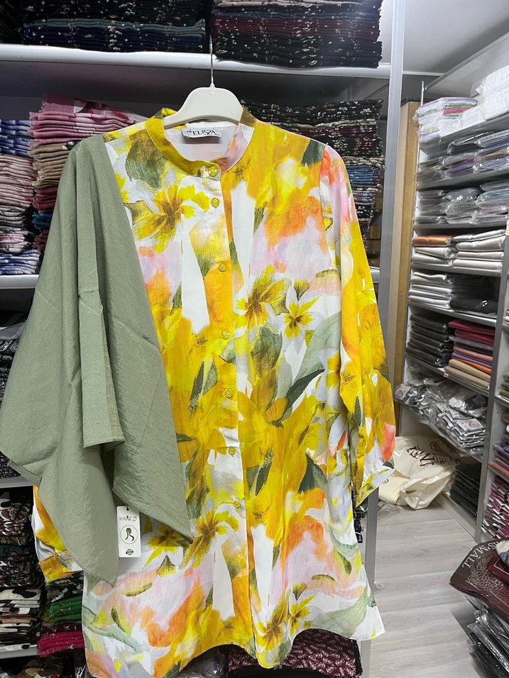 Sarı çiçek desenli, uzun kollu, düğmeli mini gömlek. Rahat kesimli ve yumuşak sentetik kumaştan üretilmiştir.