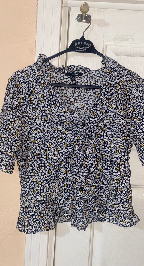 Pamuklu, kısa kollu, V yaka ve düğmeli, sarı-gri çiçek desenli bol kesim bluz. Günlük rahat sokak stili için uygun.