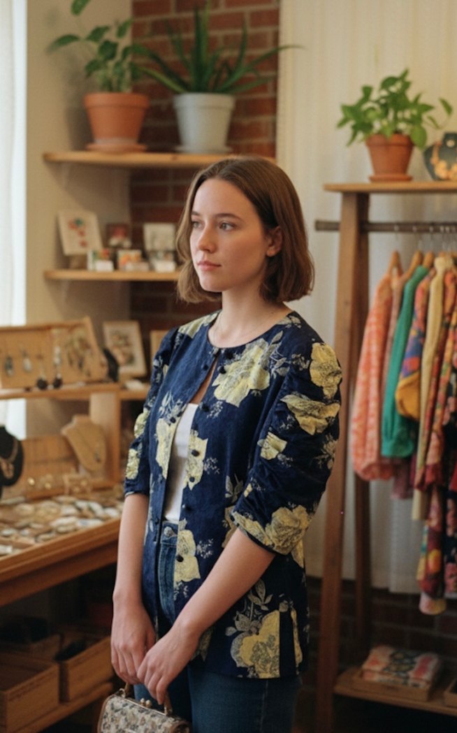 Yüksek yakalı, düğmeli ve bol kesim kadın bluz. Koyu zemin üzerine canlı sarı çiçek desenleri bulunur. Kısa, büzgülü kollar bohem tarzı yansıtır. Günlük kullanıma uygun.