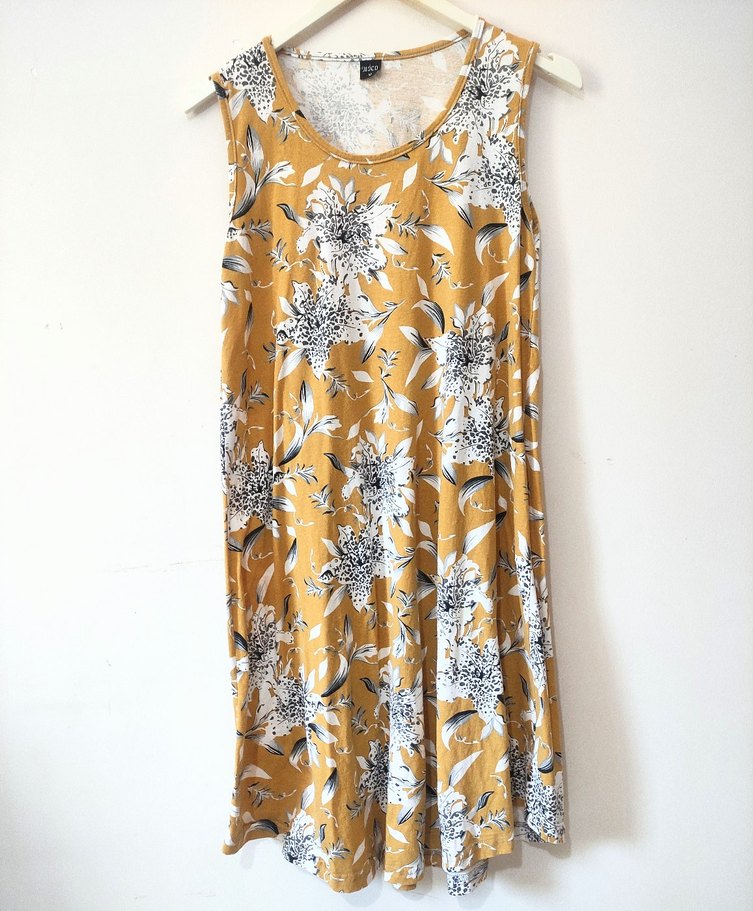 Sarı, çiçek desenli, askısız, bol kesim midi elbise. Yumuşak penye kumaştan,günlük kullanım için uygun.