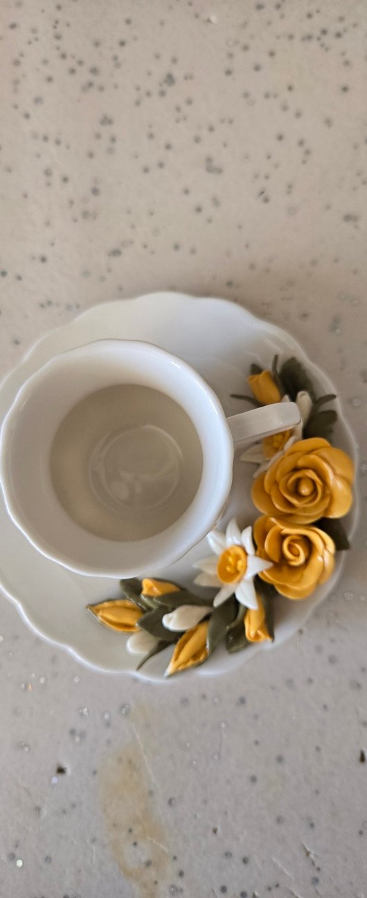 Beyaz fincan ve tabakta pastel sarı çiçek nergis ve gül detayları bulunur. Fincanın kenarları dalgalı ve pürüzsüzdür. Tek kişilik
