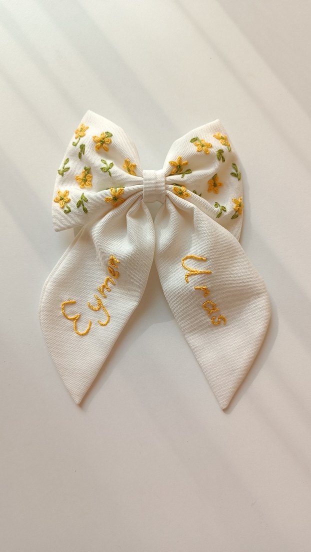 Sarı Çiçek İşlemeli Beyaz Fiyonk Saç Aksesuarı