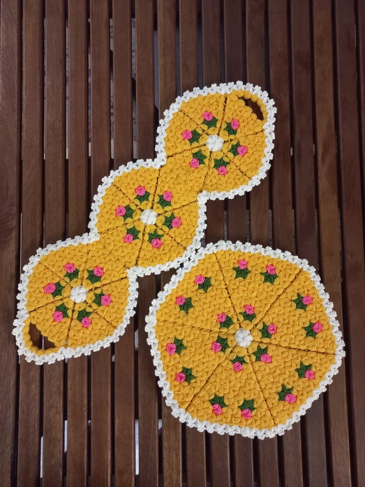 Sarı renkte, pembe çiçek desenli ve beyaz kenarlıklı geleneksel tarzda el örgüsü banyo lifi. İkili fiyatıdır.