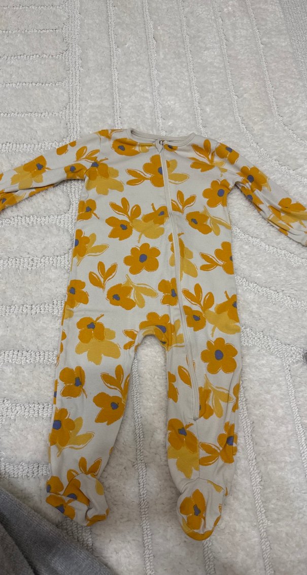 Yumuşak kumaştan, sarı çiçekli, gri detaylı ve dantel süslemeli bebek kız tulumu.