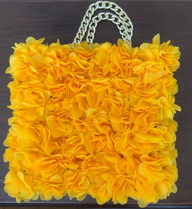Sarı renkte, zincir saplı, çiçek desenli bohem stilde fırfırlı kadın çantasıdır. Düğünlerde ve gecelerde kullanılabilir.