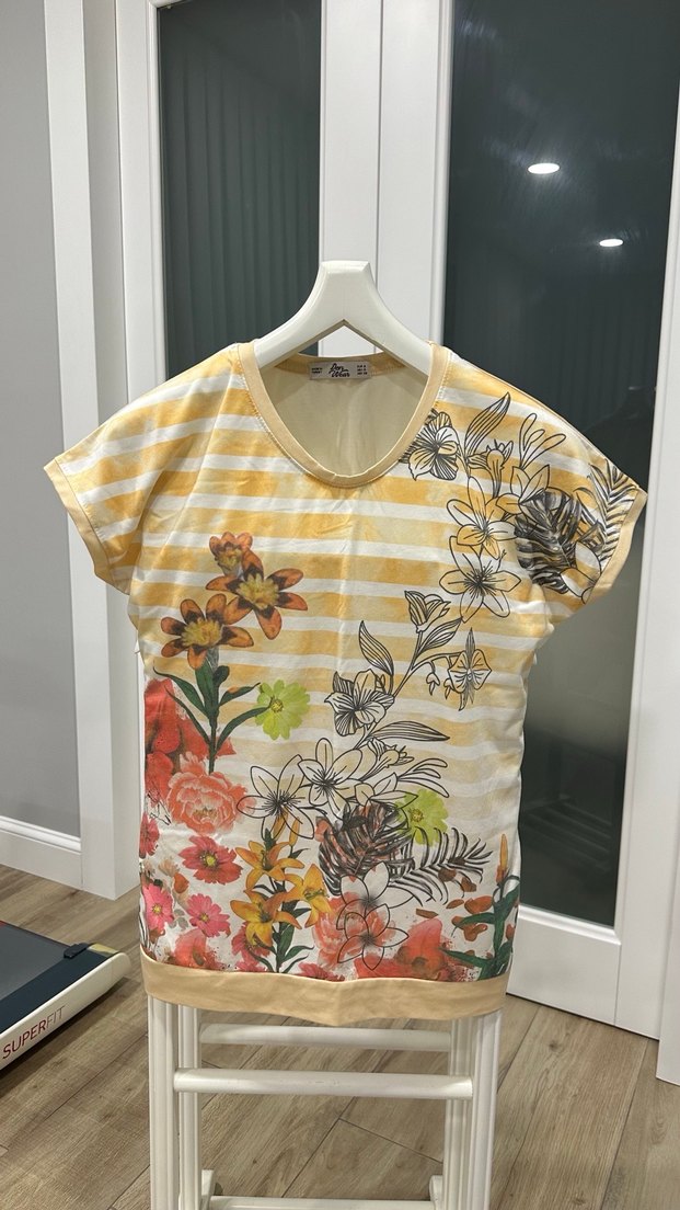 Sarı kısa kollu, bol kesim ve yuvarlak yakalı tişört, canlı çiçek desenleriyle bohem bir tarz sunar.