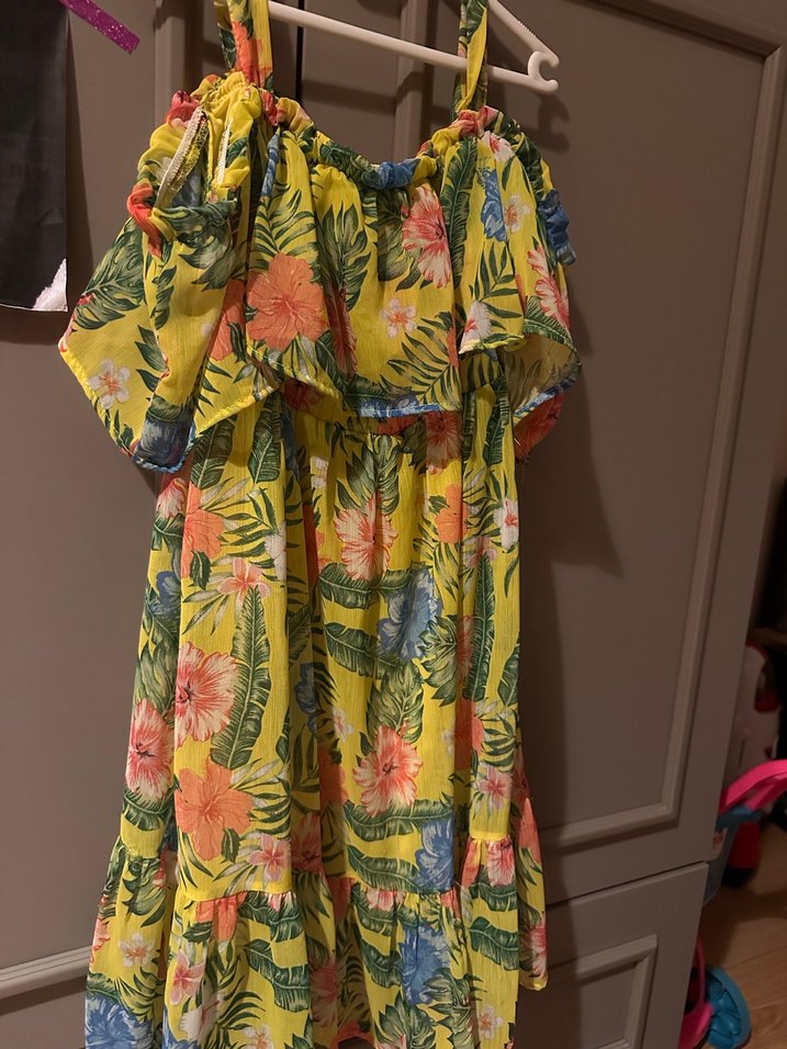 Renkli sarı, bol kesim kız elbisesi; askısız, kolsuz ve fırfırlı detaylara sahip. Bohem tarzda, çiçekli batik desenlidir.