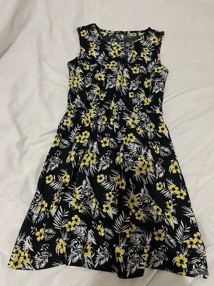 Sarı çiçek desenli, kolsuz bohem elbise, V yaka ve pileli midi boy, rahat kesimle tasarlanmıştır.