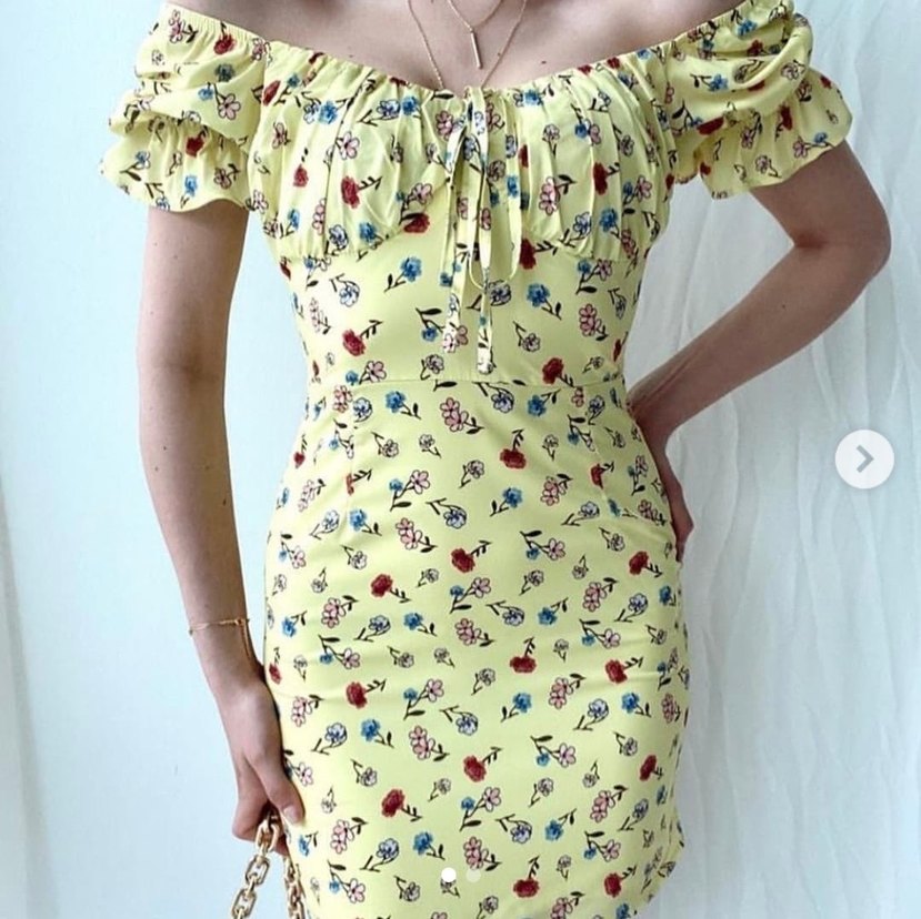 Sarı çiçek desenli, V yaka ve volanlı, askılı kollu bohem tarzda, vücuda oturan midi elbise.