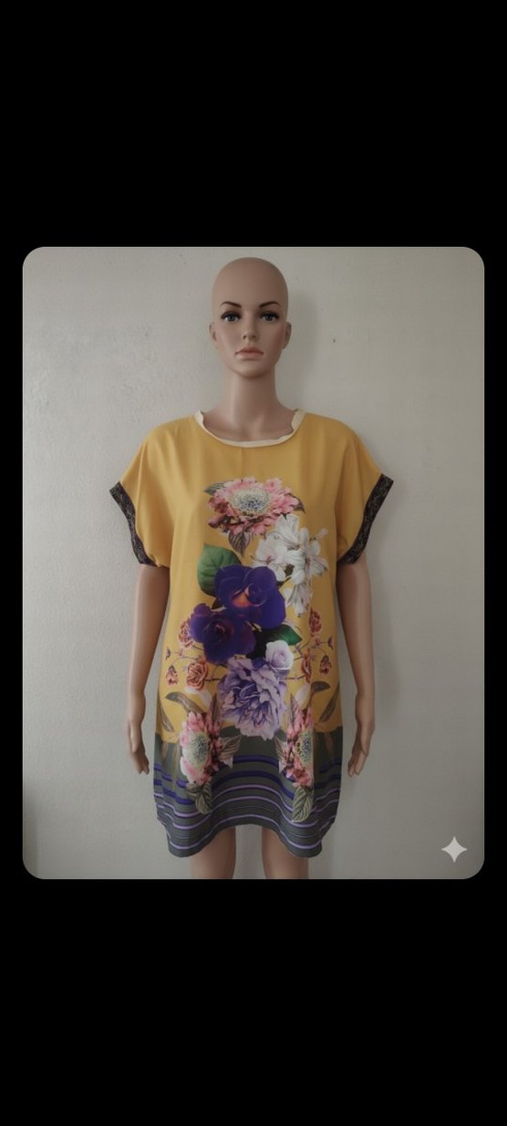 Sarı renkli, kısa kollu, bol kesim mini elbise. Çiçek desenli ve drapeli, bohem tarzını yansıtır.