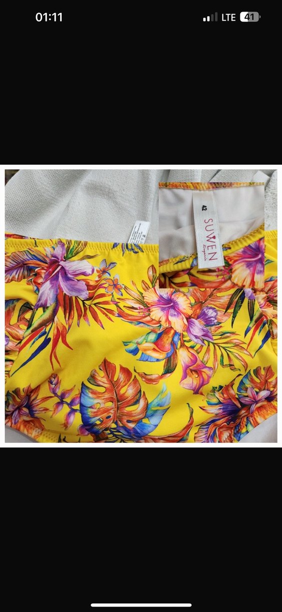 Sarı mini mayo, renkli çiçek desenli ve fermuarlı detaylıdır. Bol kesim ve kolsuz yapısıyla bohem plaj tarzına uygundur.