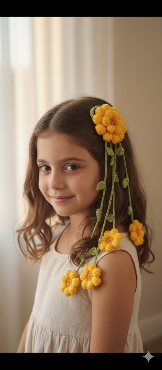 Sarı renkli, renkli çiçek desenli örgü detaylı, bohem tarzda çocuk saç tokası.