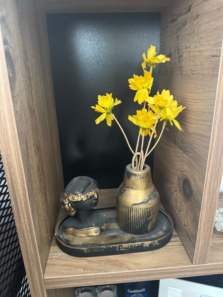 Ahşap taban üzerinde koyu renk vazoda canlı sarı çiçekler ve küçük bir büst figürü bulunan dekoratif obje.
