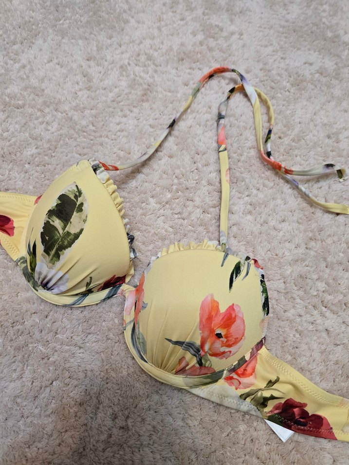 Sarı çiçek desenli, fırfır detaylı ve askılı, bohem tarzda sıkı oturan bikini üstü. Plaj için uygun.