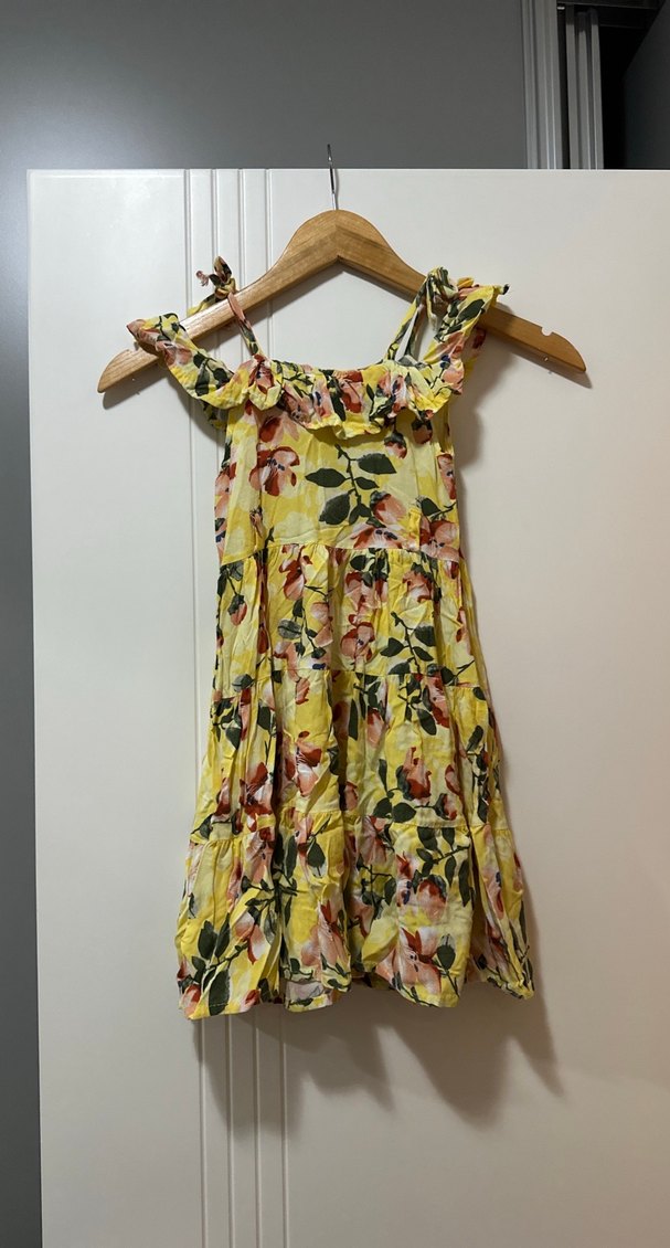 Sarı, bohem tarzda, ince askılı ve fırfırlı kız elbisesi. Rahat kesimli, bağlama desenli yumuşak kumaştan yapılmıştır.