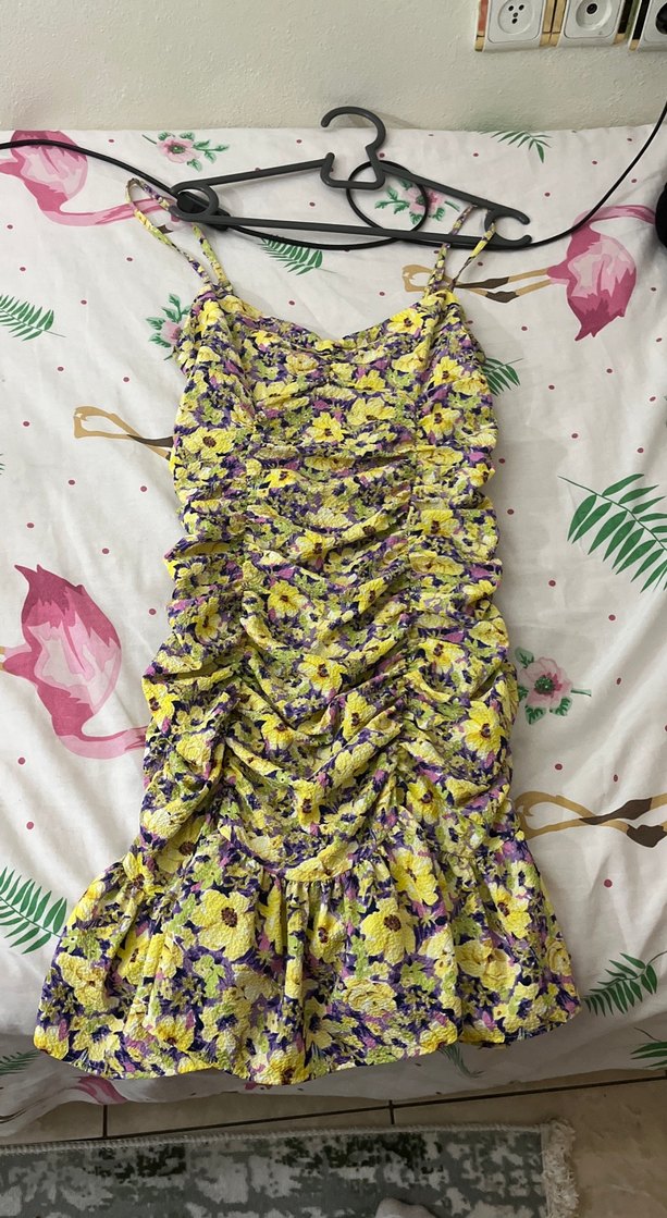 Sarı çiçek desenli, sentetik kumaştan yapılmış, fırfırlı ve kolsuz mini elbise.