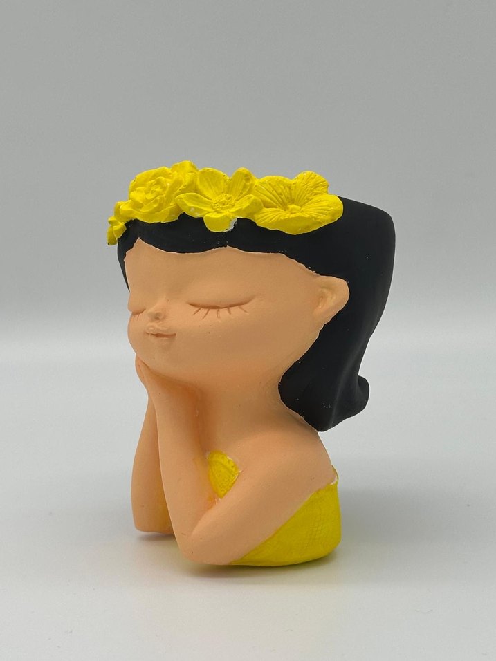 Sarı pastel renkli, siyah saçlı kadın figürin. Gözleri kapalı, elleriyle yüzünü destekliyor, üzerinde çiçek tacı var.