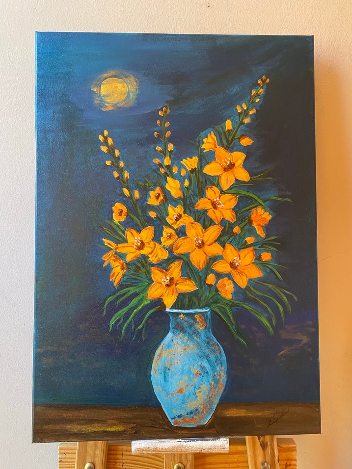 Koyu bir fonda, mavi bir vazoda canlı sarı çiçeklerin ve parlayan bir ayın olduğu tablo.
