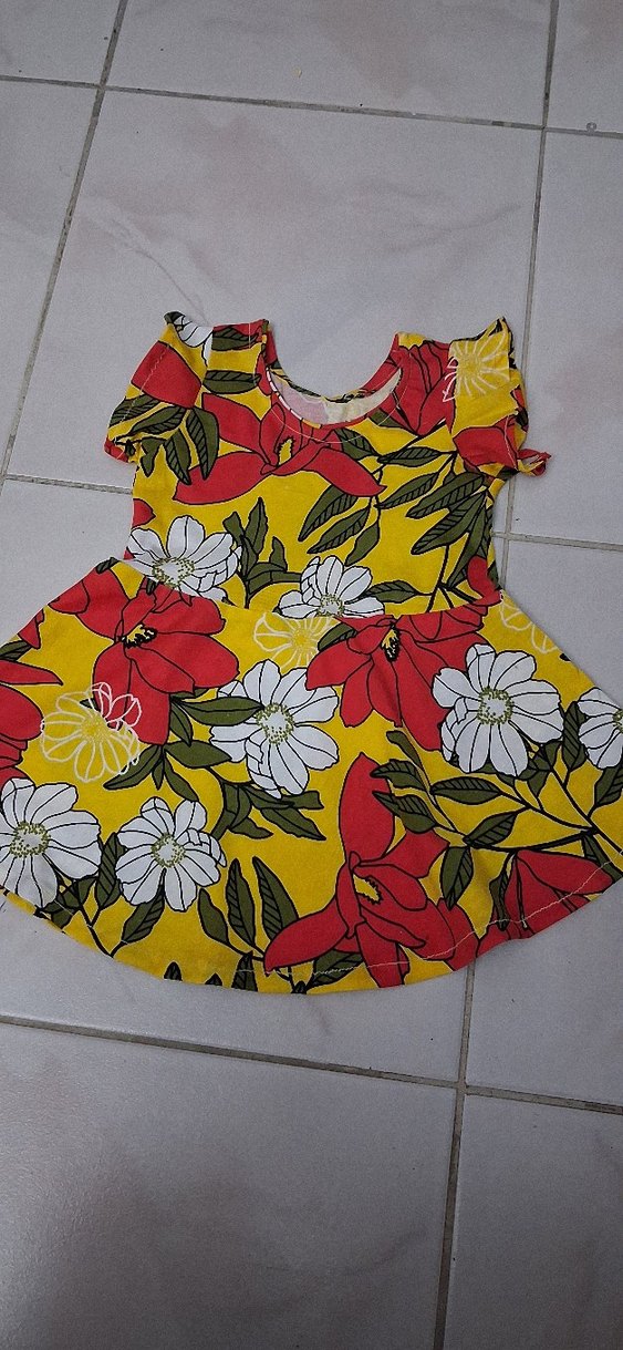 Kısa kollu, tekne yaka, sarı renkli çiçek desenli, oturan kesim kız elbisesi. Yumuşak sentetik kumaştan, fırfır detaylı, bohem ve retro tarzda.