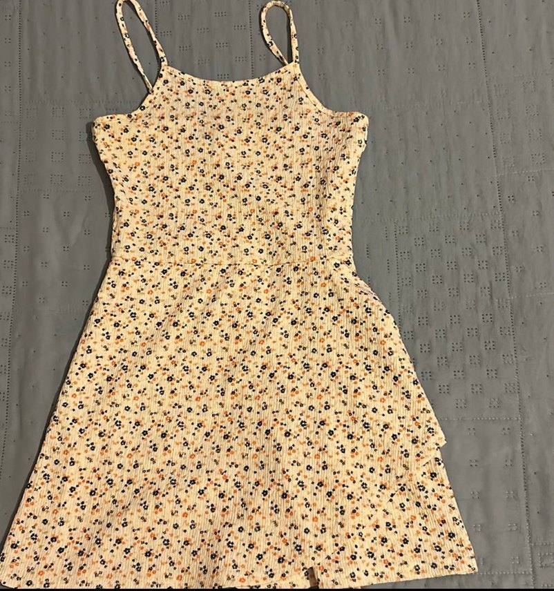 Yüksek yakalı, askılı ve çiçek desenli sarı mini elbise, yumuşak sentetik kumaştan ve fırfır detaylıdır. Bohem tarz için uygun.