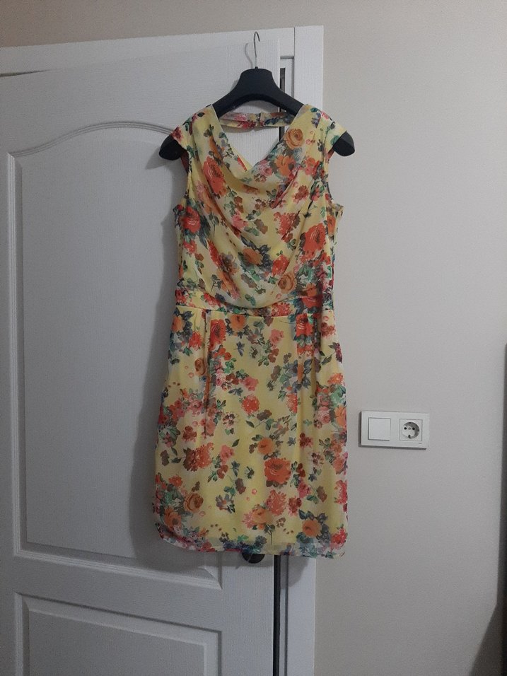 Sarı, çiçek desenli, mini boy, V yakalı, düğmeli, kolsuz ve vücuda oturan elbise.
