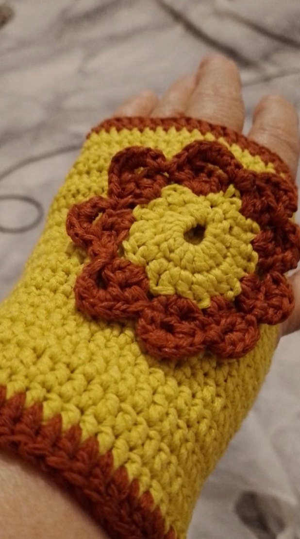 Sarı renkli, büyük kahverengi ve sarı çiçek detaylı örgü kadın eldiveni, rahat ve renkli bohem tarzda.