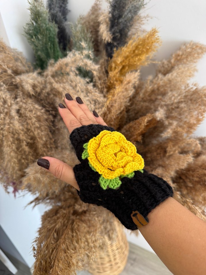 Siyah örgü parmaksız eldivenler, sarı renkli çiçek detayıyla bohem ve gotik tarzı yansıtıyor.