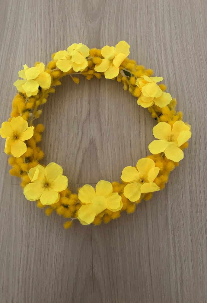 Sarı örgü malzemeden yapılmış, renkli kumaş çiçeklerle süslenmiş bohem tarzda saç aksesuarı. Kapı süsü de olabilir duvar süsüde,iki taraflı kullanılır iç kısmı metaldır.