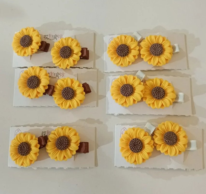 Renkli bohem tarzda, sarı çiçek ve fırfırlı detaylı çocuk saç tokaları seti.