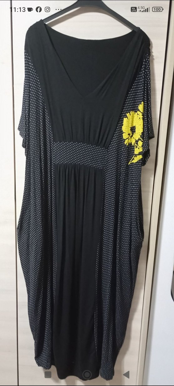 Uzun, salaş kesim hamile elbisesi, kısa kollu ve V yakalıdır. Yumuşak sentetik kumaştan üretilmiş, koyu desenli ve canlı sarı çiçek detaylıdır. çok az kullanıldı li kralı baya esnek gögüs 64 cnm sırt uzunluğu 140 cnm kalça 88 cnm