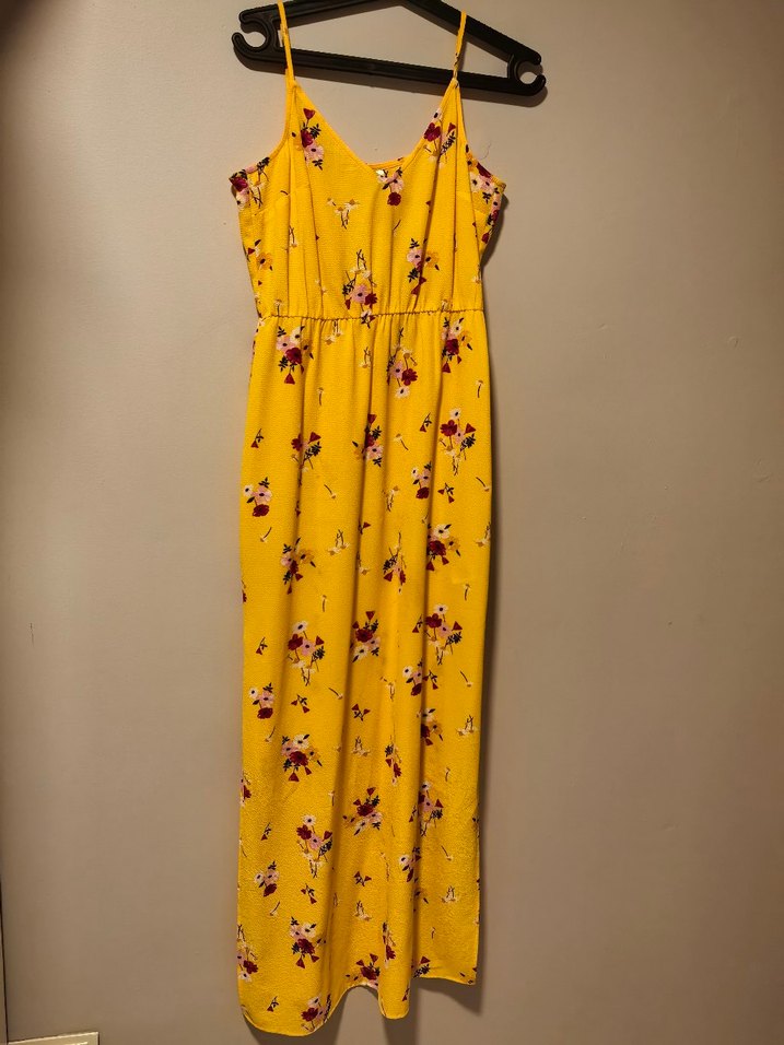 Sarı renkli, askısız yaka ve bol kesime sahip uzun elbise, rengarenk çiçek desenleri ve sentetik kumaştan bohem tarzında drapeli bir görünüme sahip.