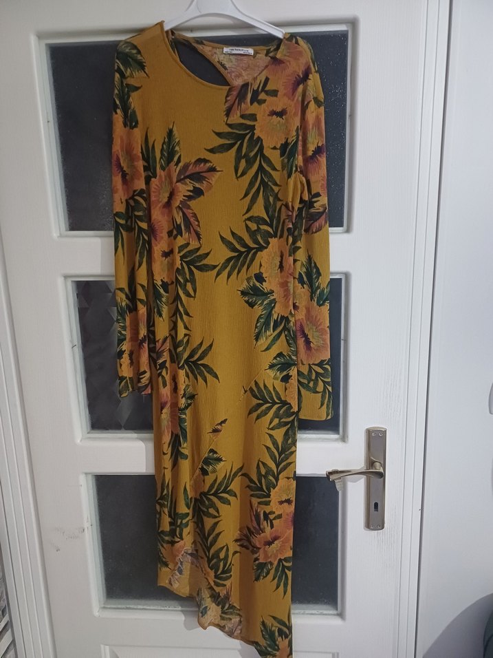 Uzun kollu, sarı zemin üzerine çiçek desenli, bol ve drapeli bohem elbisedir. Kayık yaka ile günlük kullanıma uygundur.