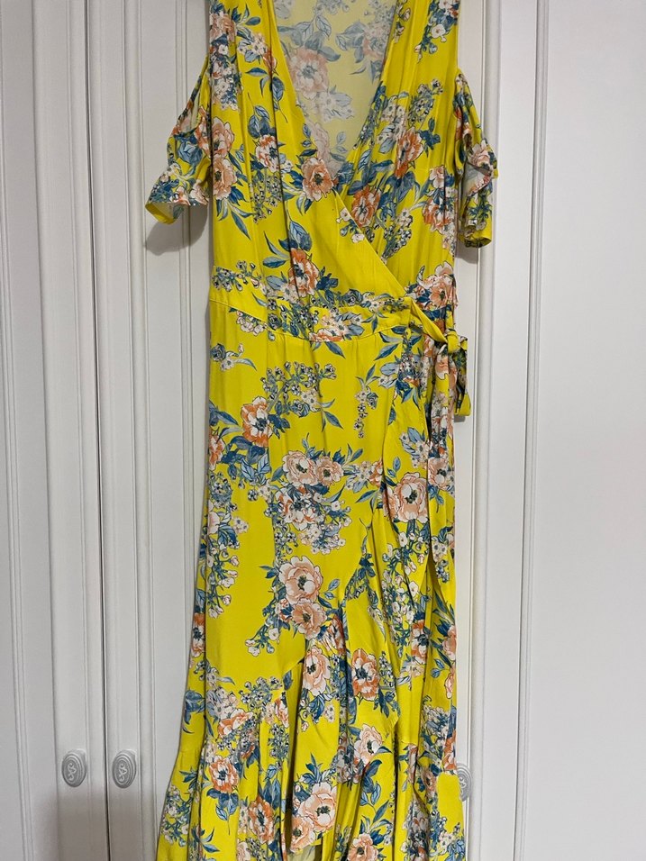 Sarı çiçek desenli, uzun ve bol kesim elbise. Straplez yaka ve kısa kollu, drapeli tasarımıyla bohem tarzı yansıtıyor. 36 bedenede uyumludur.