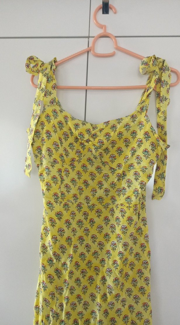 V yaka ve bağcıklı askıları olan sarı çiçekli, drapeli, bohem tarzda midi elbise. Yumuşak sentetik kumaştan, vintage desenli, dar kesim.
