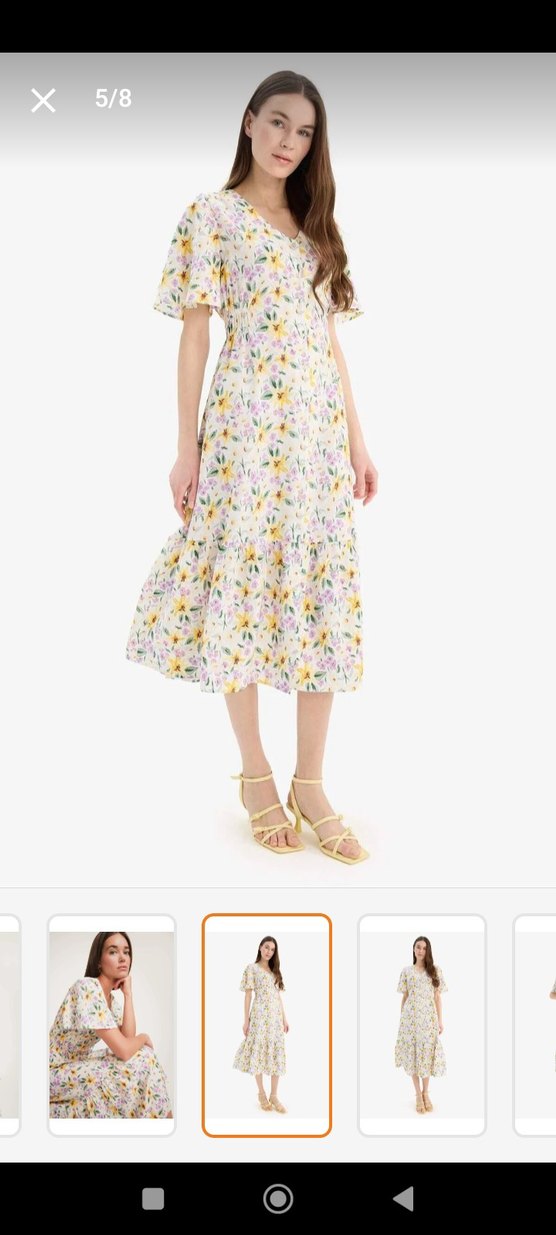 Uzun, bol kesim elbise; açık sarı çiçek desenli, V yakalı ve fırfır detaylıdır. Yumuşak sentetik kumaştan, minimal ve trend günlük tarzda, düğün için uygun. 2 kere giydim yepyeni