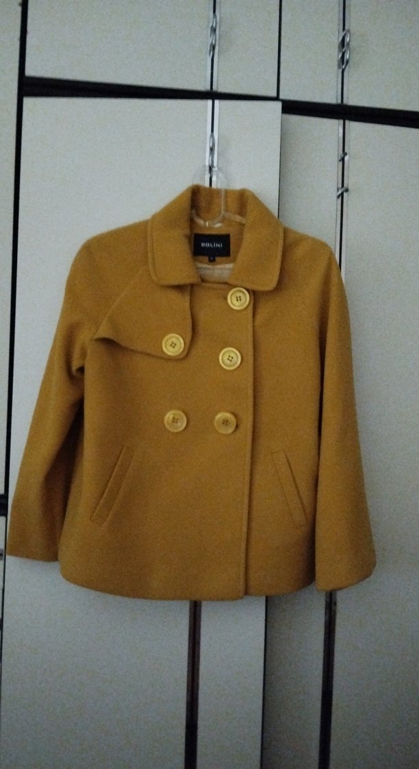 Sarı renkli, çift düğmeli kısa kaban, yumuşak dokulu, klasik yakalı ve iki ön cepli. Serin havalar için uygun.