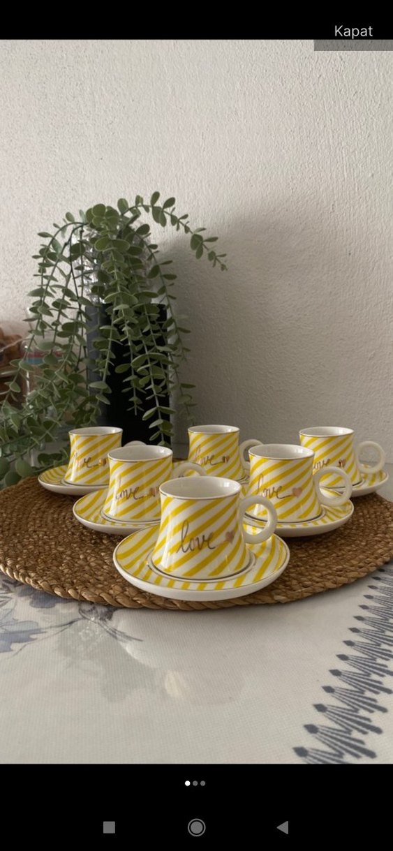 Altı adet sarı çizgili, üzerinde 'love' yazısı bulunan fincan ve tabak seti. Kahve veya çay servis için uygun. ☕