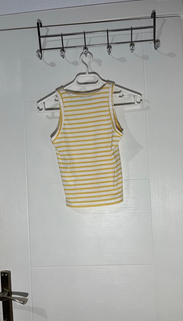Yumuşak kumaştan, açık sarı çizgili çocuk atlet, sıcak günler için uygun.