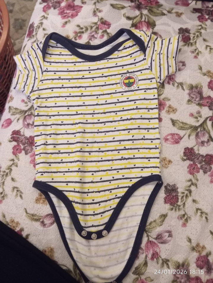 Kısa kollu, düğmeli ve yakalı bebek body. Sarı renkli çizgili ve lacivert detaylı, renkli tie-dye deseniyle sokak stili için uygun. Yumuşak sentetik kumaş.. 6/9 ay icin uygun sıfır gibidir sayılı giyildi