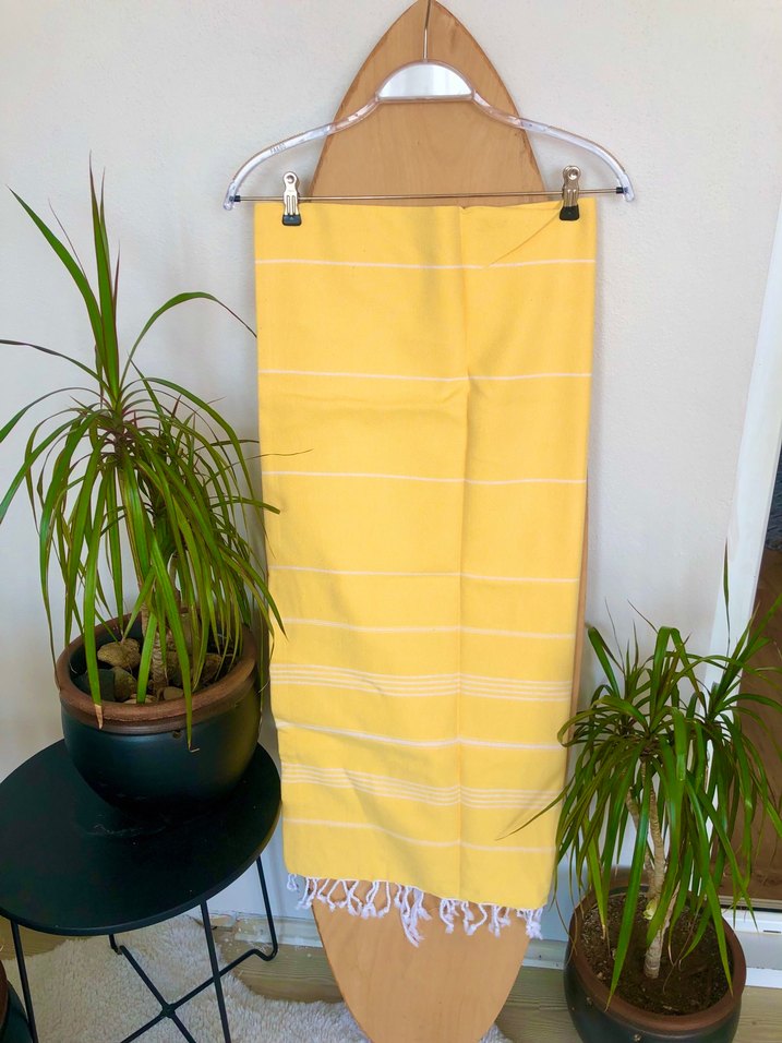 İnce çizgili, püsküllü kenarlarıyla bohem tarzda açık sarı peştamal. Yumuşak ve hafif kumaştan, banyo veya plaj için uygun.