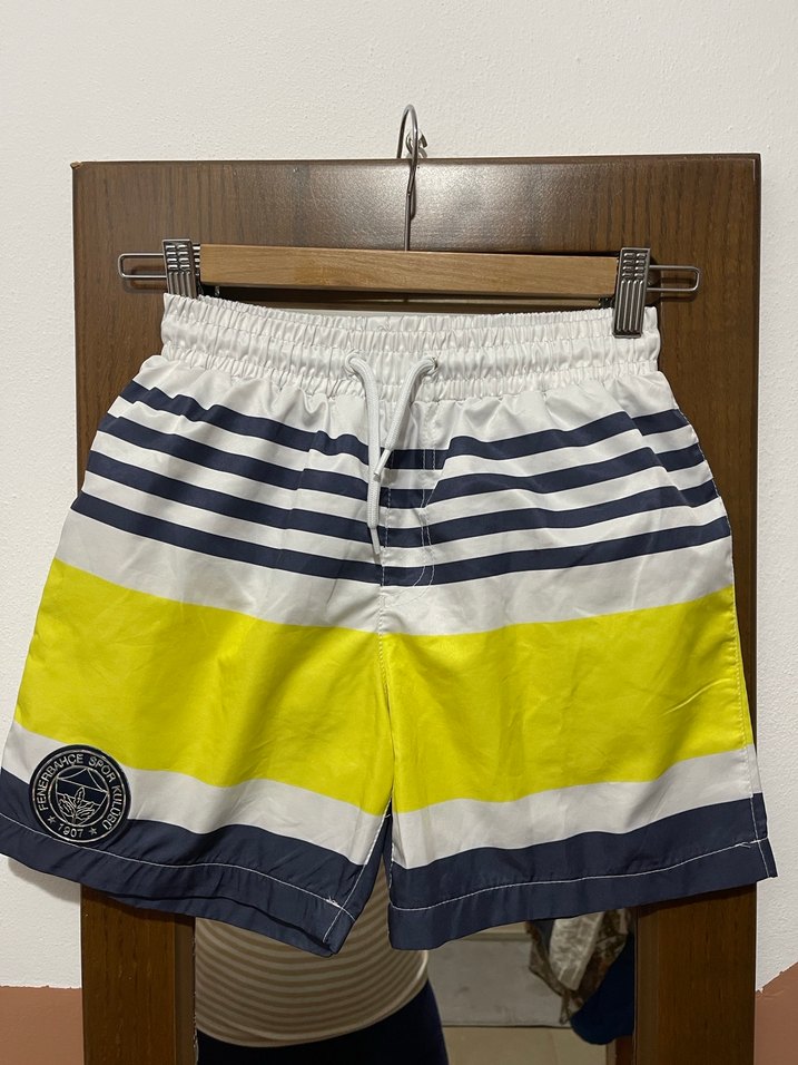 Sarı ve lacivert çizgili, lastikli ve bol kesim erkek mini deniz şortu, rahat bir plaj stili sunar. 10 11 yaş uygundur