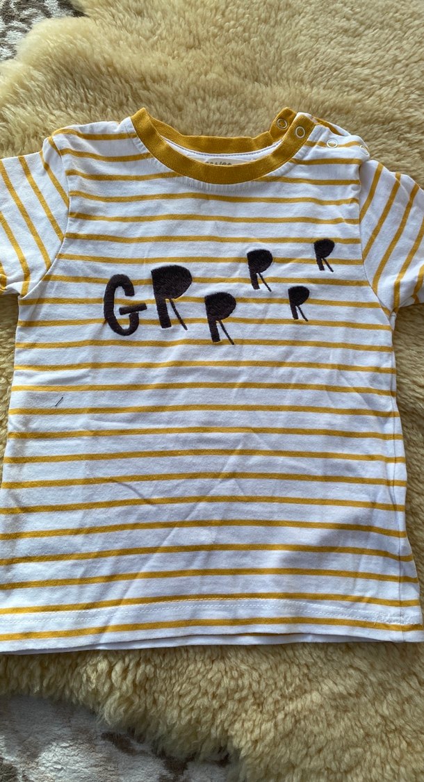 Pamuklu, sarı ve gri çizgili, düğmeli yuvarlak yakalı erkek tişört. Rahat kesim ve baskılı 'GRRR' desenine sahiptir.