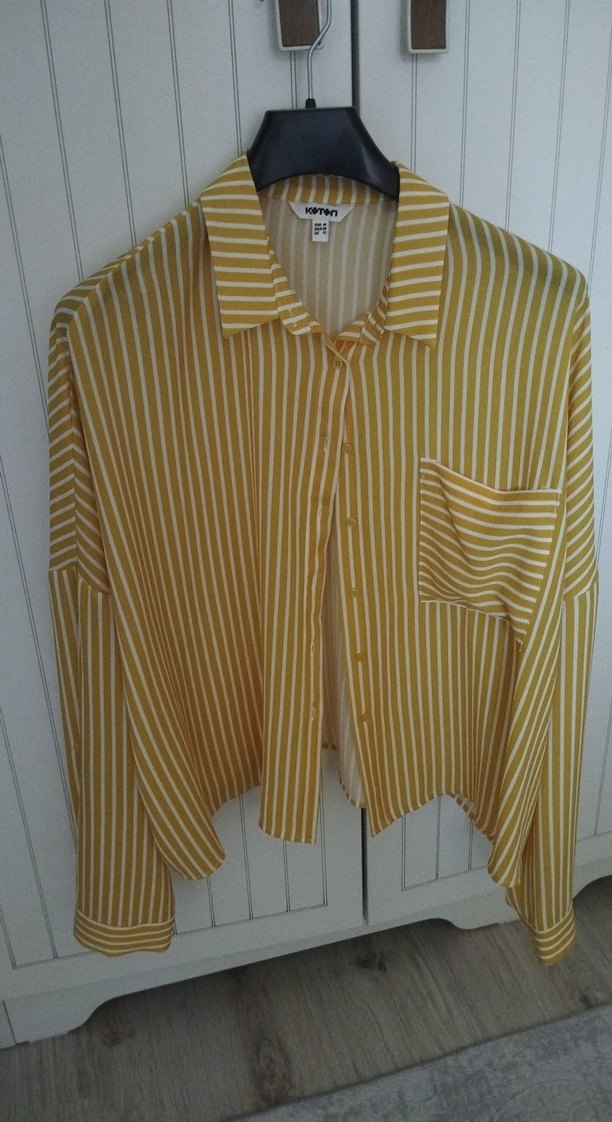 Bol kesim, uzun kollu, düğmeli kadın gömlek. Sarı çizgili, normal midi boyda, yumuşak sentetik kumaştan, günlük rahat sokak stili için uygun.
