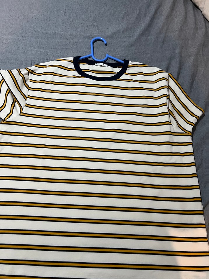 Sarı ve gri çizgili, kısa kollu, yuvarlak yakalı, ince kesim erkek tişörtü. Rahat ve şık görünüm için sentetik kumaş kullanılmıştır.