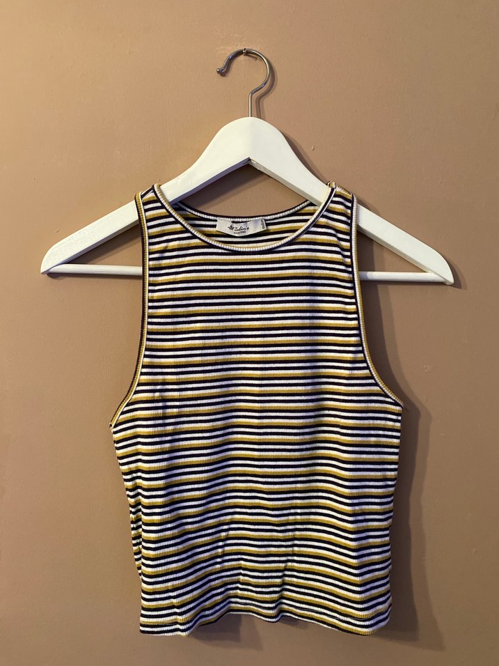 Düz kesim, sarı çizgili kadın crop top. Günlük kullanıma uygun.