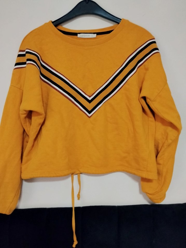 Sarı renkli, uzun kollu, bisiklet yaka kadın sweatshirt. Örgü dokulu ve parlak çizgili desenli, bol kesimdir. Altında ayarlanabilir bağcık bulunur. Rahat ve sıcak kumaştan üretilmiştir.