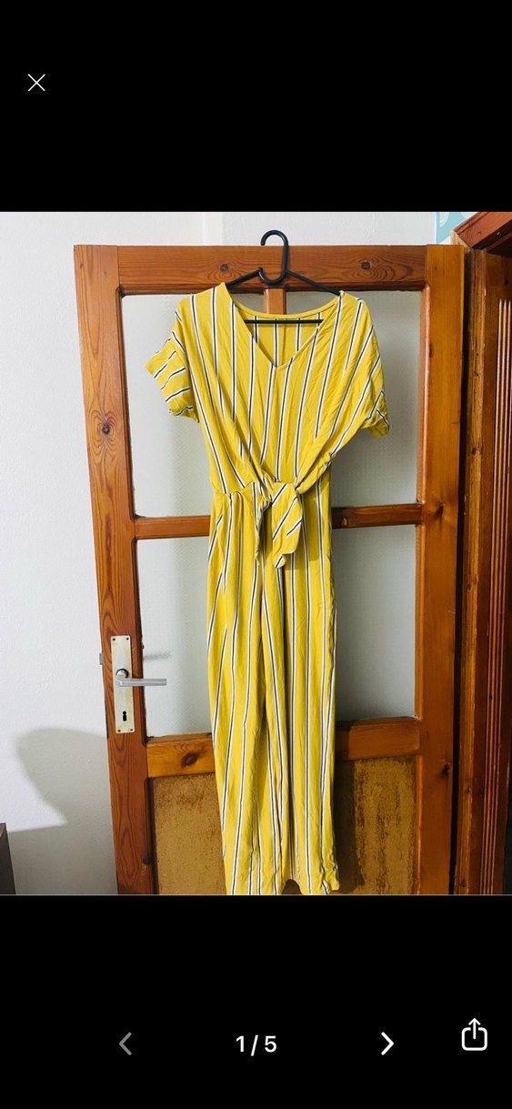 Sarı uzun tulum, V yaka ve askılı kol detayına sahip. Belden kemerli, çizgili desende, yumuşak sentetik kumaştan üretilmiştir.