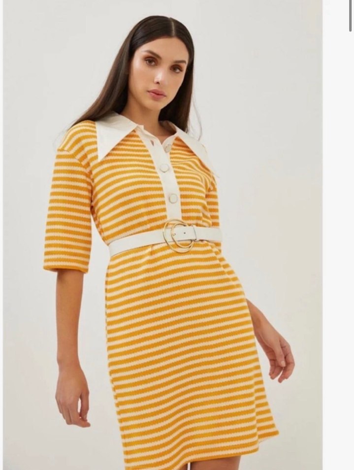 Sarı çizgili midi elbise, yakalı ve kısa kolludur. Kemerli ve vücuda oturan kesimiyle gündelik kullanıma uygundur. Pamuklu kumaş. Hiç giyilmedi fakat düğmelerden iki tanesinin beyaz baskısı düşmüştür sade metal şeklindedir fakat kullanıma engel değil isterseniz düğmelerini değiştirebilirsiniz hiç kusuru yok hiç giyylmedi yıkandı öylece kaldırıldı fotoğraftaki kemer dahil değildir kemersiz kullanım da oldukça şık.