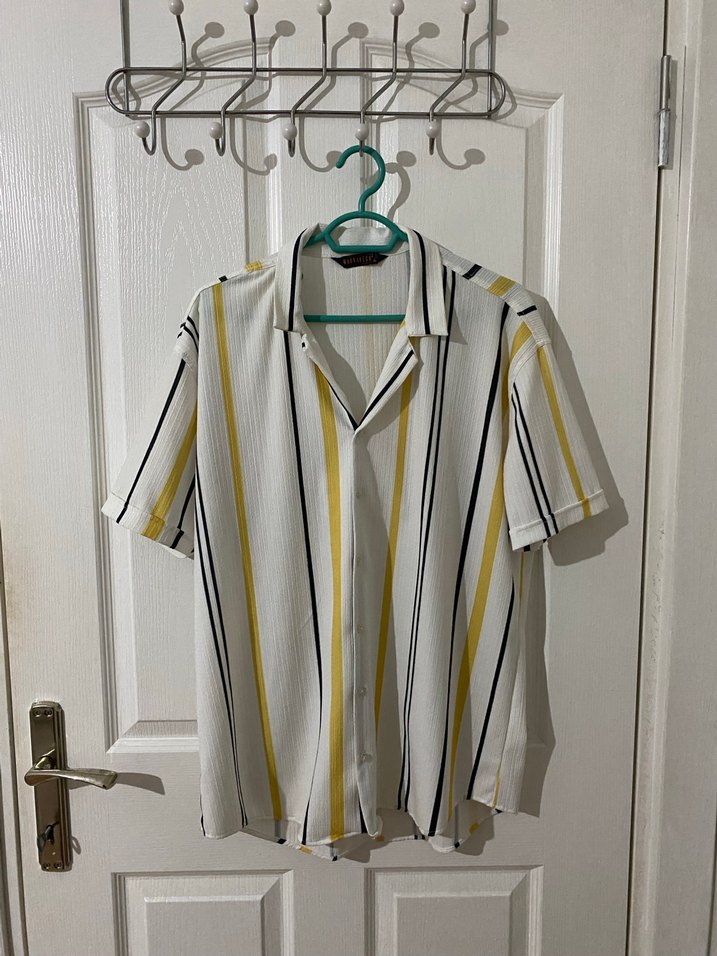 Sarı ve siyah çizgili, kısa kollu, yakalı erkek gömleği. Rahat kesimli, pilili ve sentetik kumaştan, günlük kullanıma uygun.